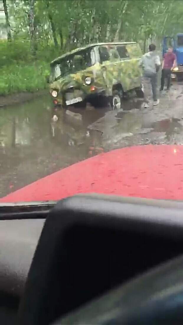 К слову, данный участок дороги, скрытый водой, «поймал» уже не первую машину. На этой неделе там же провалился УАЗ, он же «буханка».