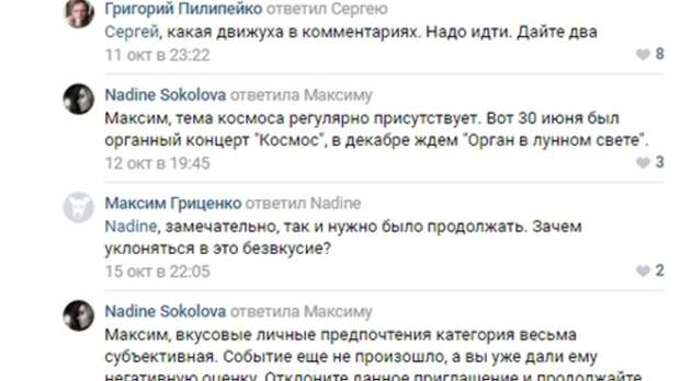 В тот же день его поддержал еще один омский священнослужитель Александр Лемешко, заявив, что решение заблокировать Александра Алексеева было принято из демонических побуждений. «Не только моего друга, но и многих других заблокировала группа Омской филармонии за то, что они корректно выразили свою позицию в комментариях. Видно завелись там дракулопоклонники и прочно заняли свои позиции», — пишет Лемешко на своей странице. Негодование священнослужителей вызвал анонс программы, которая состоится в Омской филармонии 31 октября: «Впервые Органный зал Омской филармонии распахнет двери в поздний час, чтобы под грозные и торжественные звуки органа встретить самый сумеречный праздник — Хеллоуин, канун Дня всех святых!», — говорится в паблике учреждения. В Омской филармонии Городу55 ответили, что никакого негативного подтекста в новой программе нет: «HALLOWEEN под звуки органа» посвящен известному литературному произведению «Дракула» Брэма Стокера. Однако его анонс вызвал неоднозначную реакцию у слушателей, из-за чего под постом появилась масса негативных комментариев. «Мы закрыли комментарии под записью, чтобы не появлялось негативных отзывов. Мы не хотим, чтобы наши подписчики это читали, — пояснила Городу55 специалист по связям с общественностью Омской филармонии Тамара Пономарева. — Заблокировать подписчиков могли как раз из-за негатива в коммертариях». При этом Пономарева уточнила, что официальных претензий по поводу грядущего концерта от представителей духовенства в филармонию не поступало.