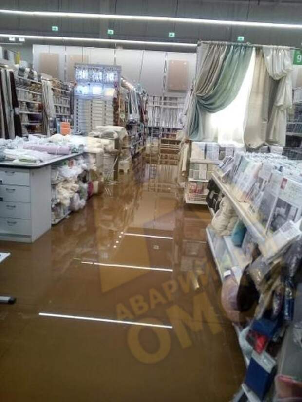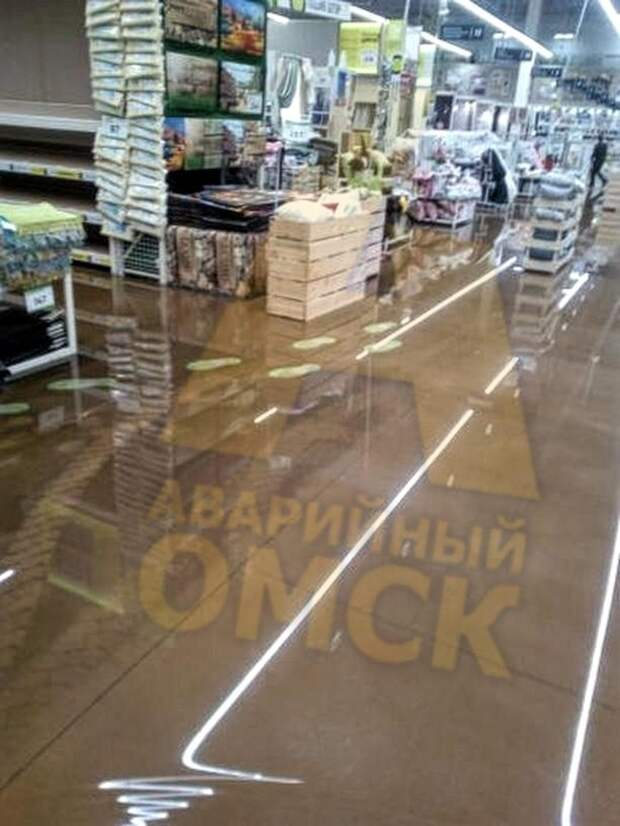 Сегодня ночью в магазине «Леруа Мерлен» около МЕГИ в Омске произошел сбой в работе системы пожаротушения. В результате магазин строительных материалов подтопило водой. Фотографии и видео потопа появились в паблике «Аварийный Омск» «ВКонтакте». Как видно на фото и видео, пол залит небольшим количеством воды: работники перемещаются по магазину, едва промочив подошвы.